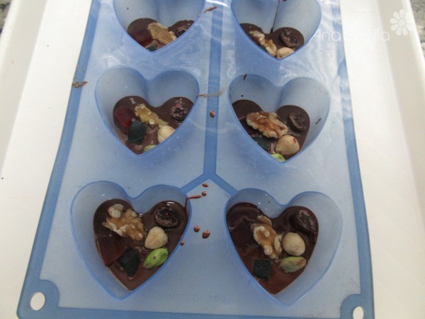 4- Poner sobre papel de hornear o en moldecitos, una cucharada sopera de chocolate. Repartir los frutos secos, frutas.... y dejar endurecer.