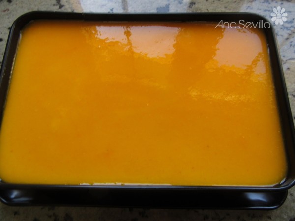 3- Coulis de mandarina: Triturar las mandarinas sin piel ni pepitas (Esto es muy importante, para que no amargue),en trozos, con la ralladura, azúcar y zumo limón, 20 seg., vel.10. Programar 15 min., 100º, vel. 3, sin cubilete. Colocar el cestillo en su lugar para evitar salpicaduras. Cuando falten 5 minutos, remojar en agua fría las láminas de gelatina. Escurrir bien y añadir al coulis, 10 seg., vel.3.