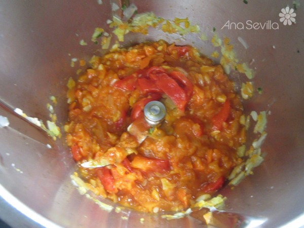 2- Pimientos asados en tiras y tomate frito, 3 min. Varoma vel. 1. Después triturar, 5 seg. vel.5.