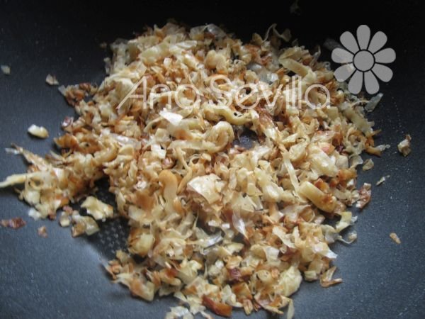 2- En una sartén, fundir la mantequilla y sofreír la masa filo cortada en tiritas como espaguetis hasta que tome color y quede crujiente. Reservar en un bol amplio.