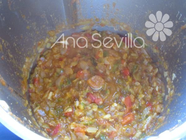 2- Cebolla, ajos, puerro, pimiento rojo y verde, tomate y aceite, 4 seg. vel.5. Bajar restos hacia las cuchillas, 12 min. Varoma, vel.cuchara, sin cubilete.