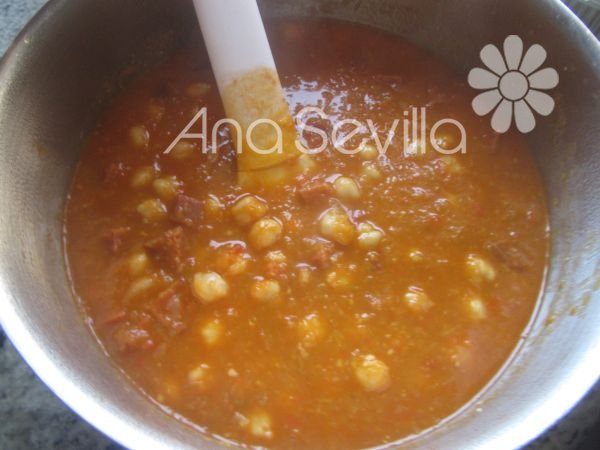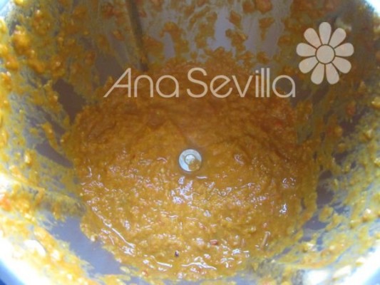 3- Añadir el pimentón, un poco del caldo y los 50 gr. garbanzos reservados, triturar, 10 seg. vel.6.