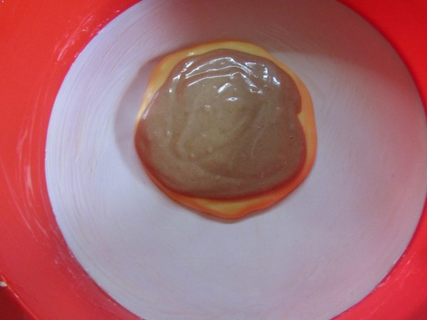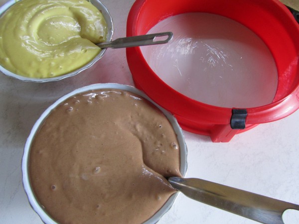 6- En un molde engrasado de unos 23-26 cm., ir echando cucharada a cucharada en el centro, alternando los colores, siempre una encima de la otra, como muestran las fotos, la masa sóla se extiende en capas. Con el filo de un cuchillo, hacer como porciones, llegando al final, una empezando desde el centro, y la siguiente, al revés, empezando como a "cortar" desde el borde del molde, así alternativamente.