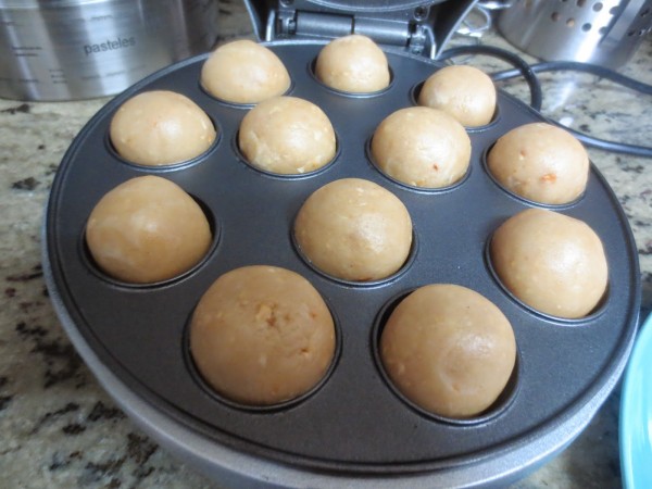 2- Precalentar la máquina cake pops, formar bolitas del tamaño de los vanos, unos 30 gr. Cocinar unos 5-7 minutos, dependiendo de cada máquina. *Ó precalentar el horno a 170º, unos 20-25 minutos.