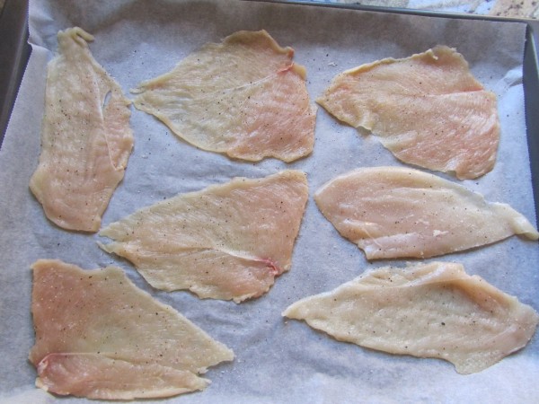 2- Colocar los filetes de pollo en 2 bandejas forradas con papel de hornear, salpimentar.