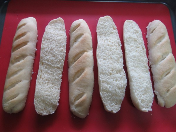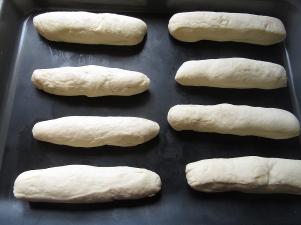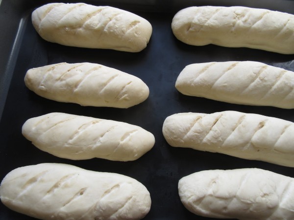 3- Desgasificar amasando un poco para quitar el aire y formar un rulo grande. Tomar 8-10 porciones de unos gr. 140 gr., formar las barritas e ir colocando los bocadillitos en una bandeja, separados entre sí . Hacer unos cortes limpios. Dejar levar tapados como media hora.