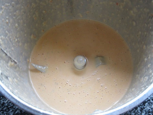 4- A continuación el coñac, agua, leche ideal, sal y pimienta, y cocer a fuego medio unos 10 minutos destapado. Después triturar con el turmix hasta que quede la salsa fina.10 seg. vel.7.