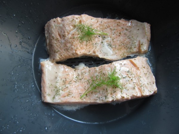 Salmón en salsa de eneldo. Hay que comer pescado varias veces al día, y con recetas diferentes, nos cansamos menos.