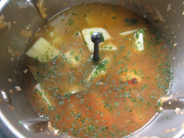 4- Agregar las patatas chascadas, carne de pimiento choricero, perejil, laurel, pimienta y agua hasta cubrir y cocer a fuego medio unos 20-22 minutos, hasta que la patata esté tierna. Podéis chafar alguna patata ya cocida para que trabe el caldo.