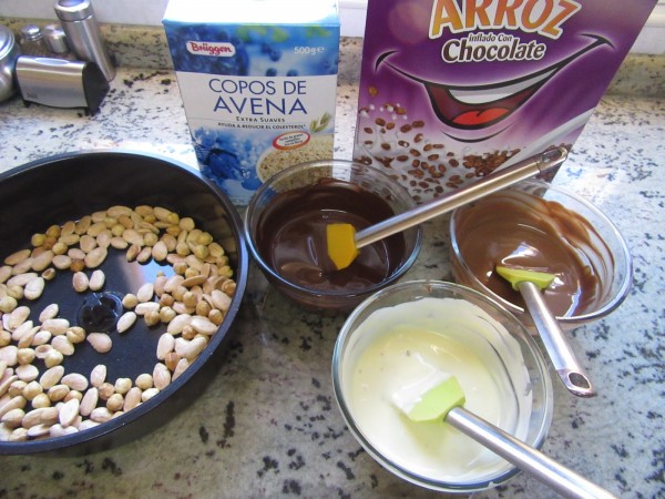 *El método es el mismo para los tres chocolates, Empezar con el blanco (A éste le pongo avena con los frutos secos) y ya los otros, todo seguidos, sin lavar el vaso.