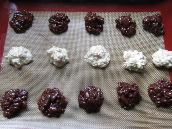 2- Añadir los frutos secos y cereales, mezclar bien. Dejar templar unos minutos y con una cucharita poner montoncitos sobre papel hornear o silpat. Dejar endurecer y despegar.