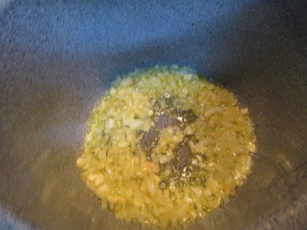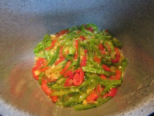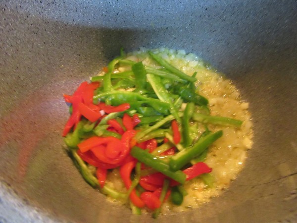 2- Sofreír la cebolla y ajos, con un poco de aceite, hasta que comience a estar transparente. Añadir el pimiento verde en tiras (Podéis picarlo mas pequeño a gustos) y asado, y rehogar unos 5 minutos.