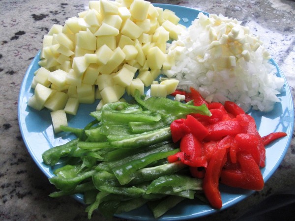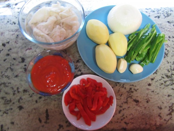 1- Picar la patata en trozos menudos. la cebolla y ajos y el pimiento verde en tiras Reservar.