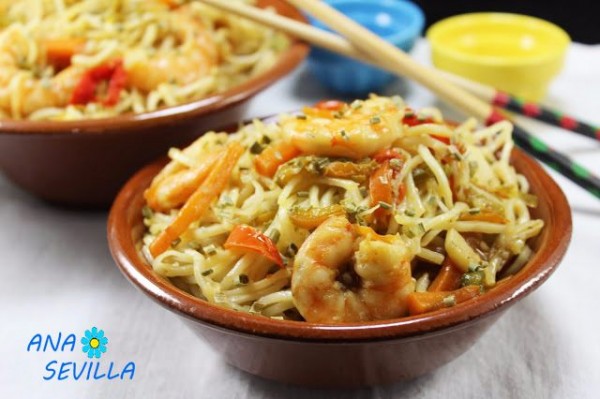 Noodles con verdura y langostinos. Fideos asiáticos que ahora están mucho de moda. Están muy ricos con mucha verdura y el toque de marisco.