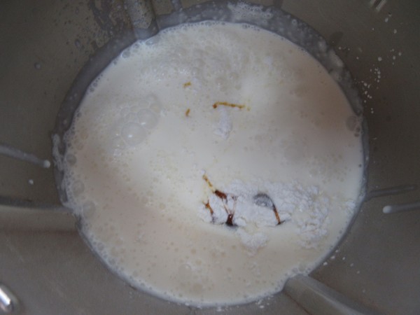 2- Resto de ingredientes: huevos, azúcar, maizena, agua, colorante y vainilla, triturar con el turnmix y llevar a fuego moderado sin que llegue a hervir y espese.