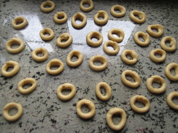 4- Engrasar la mesa de trabajo con aceite, tomar porciones hacer tiras y unirlas, a modo de rosquillitas, o hacer bolitas y meter el dedo en el medio y estirar.