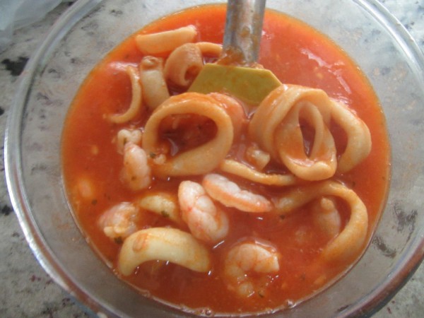 4- Tomate frito, caldo pescado,pimienta, sal y perejil picado, cocer unos 20 minutos a fuego bajo-medio. Comprobar que estén tiernos. Añadir las gambas y 2 minutos más.