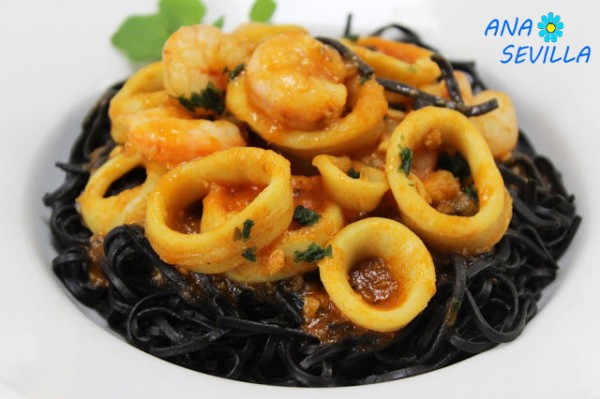 Espaguetis nero di sepia con calamares