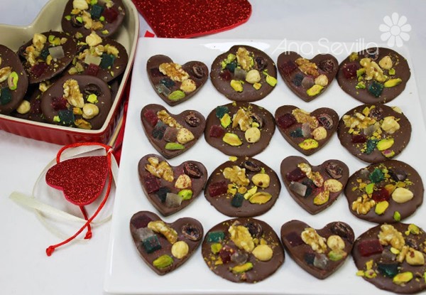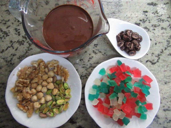 2- Poner sobre papel de hornear o en moldecitos, una cucharada sopera de chocolate. Repartir los frutos secos, frutas.... y dejar endurecer.