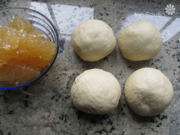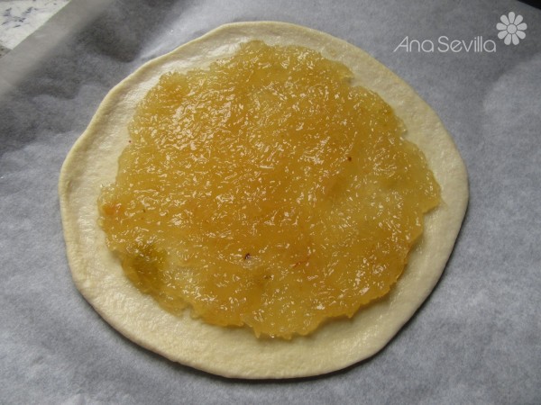 3- Quitar el aire a la masa, (Desgasificar) , dividir en 4 porciones de unos 200 gr. cada una , y estirar en forma de círculo. (Si encoge la masa, dejar unos minutos que se relaje). Extender el cabello de ángel en dos bases, pincelar los bordes con agua, tapar y presionar con los dedos para cerrar. Tapar con un paño y dejar levar una media hora.