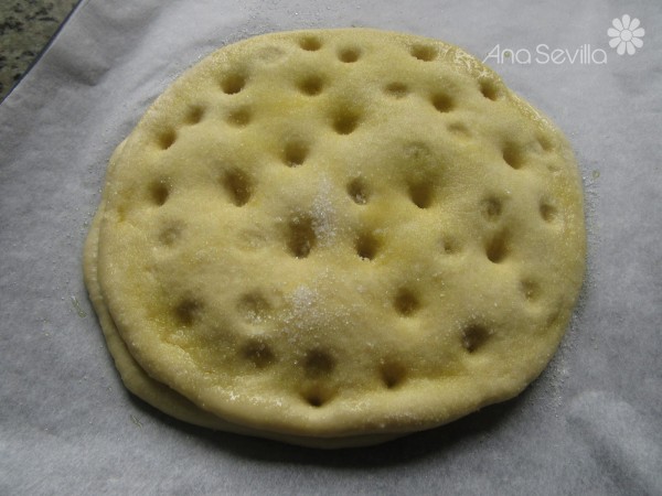 5- Pincelar las tortas generosamente con aceite de oliva, espolvorear azúcar y hacer unas hendiduras con los dedos.