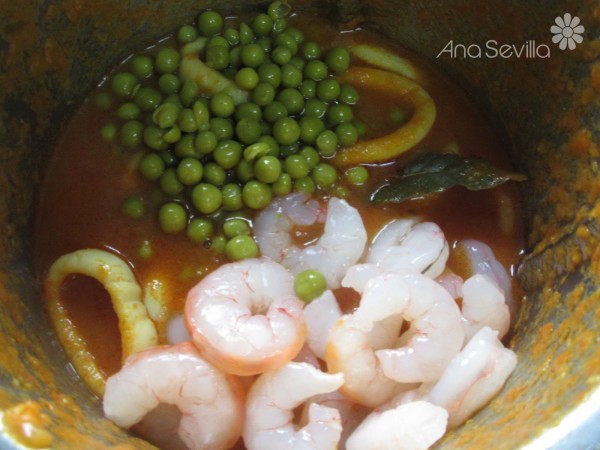 5- Por último, agregar las gambas y guisantes y cocer 2 minutos. Dejar reposar unos minutos y servir caliente espolvoreado de perejil picado.