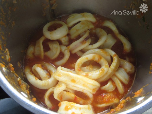 3- Añadir los calamares al sofrito, sofreír 5 minutos, que cambien de color