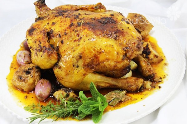 Pollo asado a la mostaza con un sabor muy original, y el jugo que le dan las manzanas y las chalotas o cebolla.