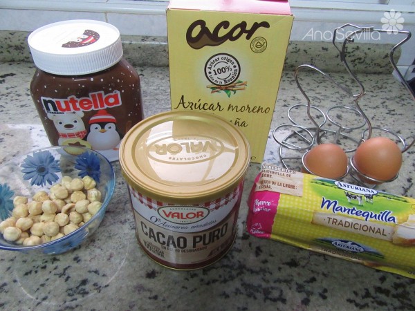 2- Fundir la mantequilla con la nutella 1 minuto en el microondas. Reservar. Mezclar con varillas la harina con el cacao puro y pellizco de sal. Reservar. Majar las avellanas un poco en el mortero. Reservar.