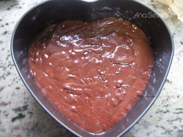 4- Verter la mezcla en un molde de unos 20 cm., engrasado, dar unos golpecitos contra la meseta para quitar las burbujas de aire y que se alise.