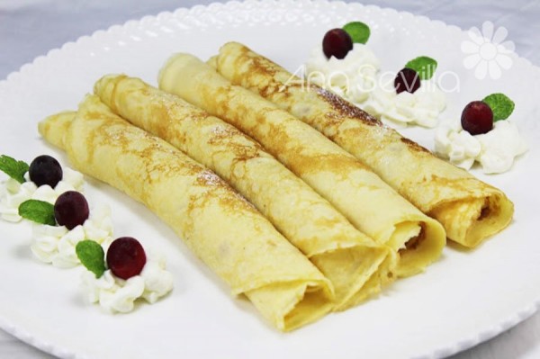 2- Calentar un poquito de manteca en una sartén antiadherente de unos 20 cm. de diámetro, a fuego medio-fuerte, e ir cuajando las filloas pincelando cada una, un minuto por cada lado. (Salen unas 6 unidades). Dejar enfriar y rellenar con una tira de crema y enrollar.