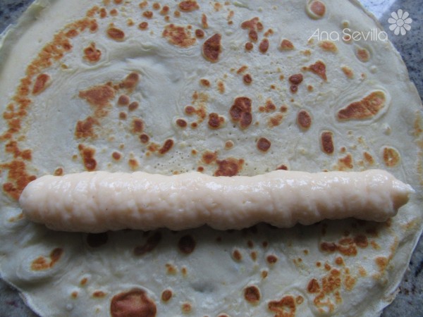 2- Calentar un poquito de manteca en una sartén antiadherente de unos 20 cm. de diámetro, a fuego medio-fuerte, e ir cuajando las filloas pincelando cada una, un minuto por cada lado. (Salen unas 6 unidades). Dejar enfriar y rellenar con una tira de crema y enrollar.