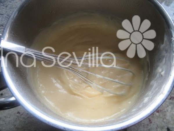 2- Llevar a fuego bajo sin parar de remover con varillas y sin que llegue a hervir hasta que espese. Llenar una manga pastelera y dejar enfriar completamente.