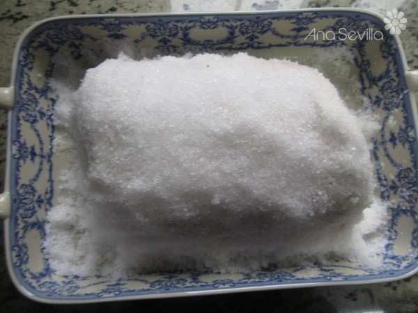 2- Cubrir el fondo de una fuente de horno con una capa de 2 cm. de sal gorda,, colocar el lomo encima, (Sin el film), y tapar con el resto de sal compactando bien con las manos, que quede totalmente cubierto. Salpicar con los dedos unas gotitas de agua.