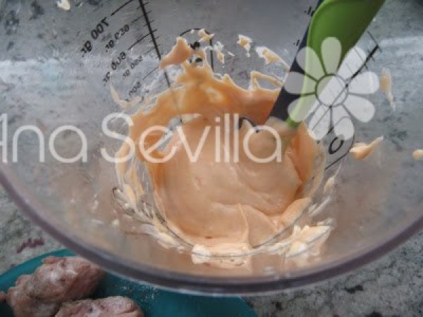 3- Hacemos la mayonesa: Ajos, huevo, aceite girasol y el restante de freír la carne, vinagre, pimentón y sal. Triturar sin levantar el brazo de la batidora, hasta que se una todo, subir y bajar el brazo poco a poco hasta que ligue.