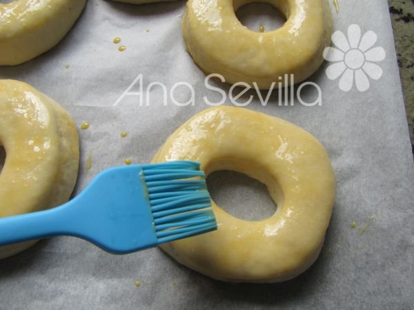 3- Cortar la masa como si fueran donuts, cortador de unos 10-11 cm y 3-4 cm. Con el resto de la masa apretar y volver a estirar.