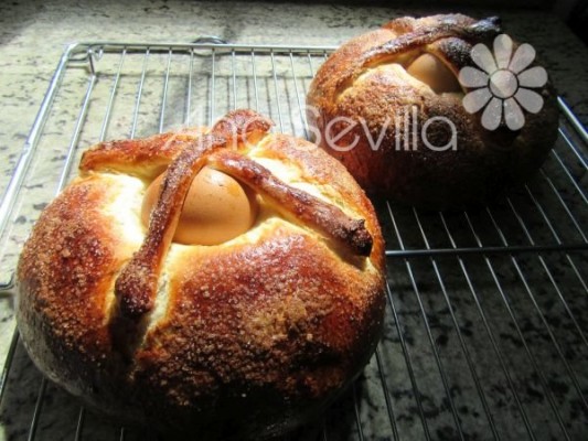3- Dividir la masa en dos trozos de unos 400 gr. cada uno quitar un trocito de cada porción del tamaño de unos 25 gr., para hacer las tiras. Formar dos bollitos, incrustar en el centro el huevo cocido. Poner tiras en forma de cruz humedeciendo los bordes con agua. Pincelar con yema mezclada con agua y dejar resposar una media hora.